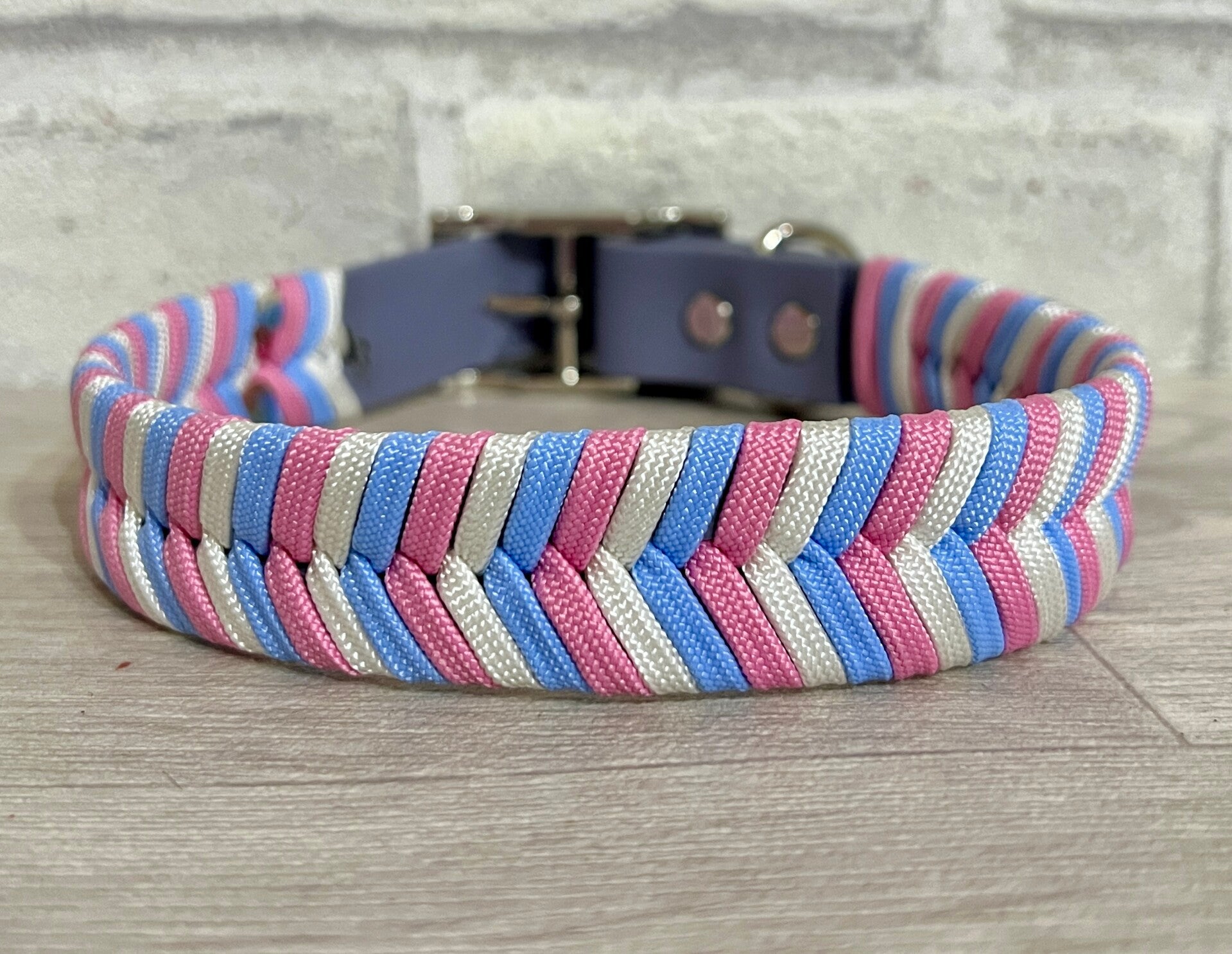 Biothane Halsband mit Paracord umflechtetGraue Biothane mit Rosa,Weiss und Hellblauen Paracord